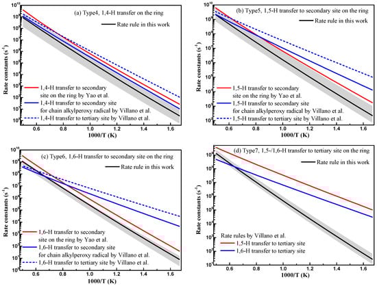 The rate rules for H-transfer for cycles are shown in Figure 11. Figure 11a plots the rate rule for 1,4-H transfer for a cycle, for which the uncertainty was estimated as a factor of 5. In this work, we did not distinguish between the reactions involving H-transfer to secondary sites and those to tertiary sites. Yao et al. [] proposed a rate rule for 1,4-H transfer to secondary sites for cycles and Villano et al. [] developed two sets of rate rules for 1,4-H transfer to secondary and tertiary sites for chain alkylperoxy, respectively. The rate rule for 1,4-H transfer to secondary sites provided by Villano et al. [] coincidently falls into the range of uncertainty for the present rate rule. The rate rules provided by Yao et al. [] are five times greater than the present results at high temperatures and become ten times greater at 600 K. The rate rule for 1,5-H transfer to secondary sites is plotted in Figure 11b, accompanied by the rate rule for the same reaction class provided by Yao et al. [] and those for 1,5-H transfer to secondary and tertiary sites for alkylperoxy radicals provided by Villano et al. []. Since the uncertainty for the present rate rule was estimated as a factor of 4, the rate rule provided by Yao et al. [] was found to agree fairly well with the present rate rule. Figure 11c presents the rate rule for 1,6-H transfer to secondary sites with uncertainty estimated as a factor of 3. It can be seen that the rate rule proposed by Yao et al. [] for the same reaction class is four times greater than the present results. Finally, Figure 11d shows the rate rules for 1,5-H transfer and 1,6-H transfer to tertiary sites. The greatest rate constants are about seven times the lowest value and, hence, the uncertainty can be estimated as a factor of 3. The value of the rate rules provided by Villano et al. [] again demonstrate significant disagreement with the present results.
