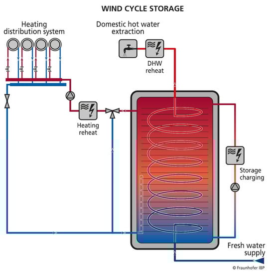 The first technology introduced and investigated uses the excess electricity and stores it as thermal energy in water-based thermal storage (WBTS). The water in the tank is heated and stratified by a powerful direct electric-flow-type heater. Domestic hot water (DHW) is supplied by a DHW exchange module connected to the hot water tank. Whenever the storage temperature is lower than the design temperature for DHW, a small electric flow water heater raises the temperature to the desired setpoint temperature. Space heating is carried out via a common building heat transfer system with low supply temperatures, such as panel heating. The inlet temperature for the building heat transfer system is raised by another electric flow water heater whenever the desired temperature is not achieved by the storage temperature. Both small additional water heaters are introduced to prevent the unwanted heating of the WBTS’s large volume, if no excess electricity is available. The dimension and the water volume of the tank, respectively, can be determined by a newly developed procedure called the “wind period method” [20]. The tank should be well insulated to minimize the passive heat dissipation through the storage walls. The principal scheme of the hot water storage tank system is shown in Figure 1.