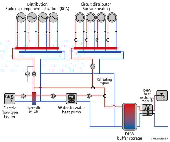 To charge the components with available excess electricity, a powerful direct electric-flow-type module water heater is used. Whenever the passive heat dissipation of the component is not enough to keep the indoor climate above the setpoint temperature anymore, a pump is activated to recirculate the water from the piping inside the component to an additional panel heating system outside of the insulation. Whenever the temperature in the component’s core becomes lower than the setpoint inlet temperature for the panel heating, a water-to-water heat pump is activated to increase the water temperature level. The energy source, or primary side for the heat pump, is the component core of the TABS. This heat pump is also used to prepare domestic hot water, because the setpoint temperature for DHW is above the component core temperature. Whenever the component core temperature falls below the lower limit (about 17 °C), the electric water heater is used to keep the design temperatures. The principal scheme of the thermally activated building storage system is shown in Figure 2.