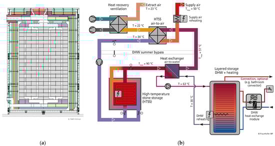 (a) Technical drawing of the HTSS including the stone core made of bricks, the different insulation layers, and air channels. (b) Sketch of the integration of an HTSS into the technical building equipment for supplying a building with space heating and domestic hot water. It shows the operating state with simultaneous hot water preparation and supply air heating (space heating).