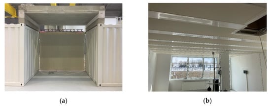 The development of hardware and control software of the storage system was aided by an extensive two-phase measurement campaign. During the pretest phase, the storage systems were loaded and discharged with stationary boundaries to be able to evaluate their performance and generate validation data for the simulation models. The second in situ phase included real boundaries such as climate and synthetic users, primarily to evaluate and optimize the control system. Since this paper describes the validation and calibration of the storage models, only the pretest phase is elaborated upon here. A single ceiling segment of the new construction TABS storage was installed in the Fraunhofer IBP’s technical center (Figure 4a). The retrofit TABS storage was installed in the living room of one of the twin houses (Figure 4b). The twin houses are two identical, typical, single-family homes on the IBP’s field test site that are often used for model validation [27,28]. To obtain a comprehensive validation dataset, these two TABS storage units were charged and (active and passive) discharged according to a fixed program, as shown in Table 1.