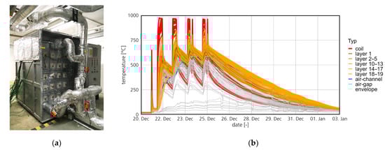 (a) Final, full-size HTSS prototype. (b) Long charging period with the temperatures of the heating rods (coils) (red) and all thermocouples in the stone core (orange) and the envelope (gray).