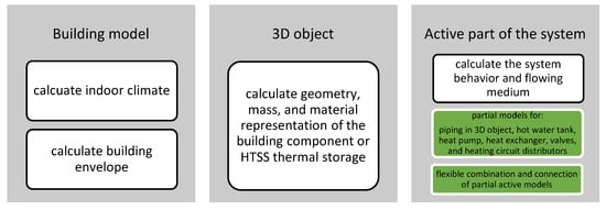 To represent the described thermal storage systems and their interactions with the building, a simulation framework is used and further developed. The sketch of the different simulation models working together and described below is drawn in Figure 6.