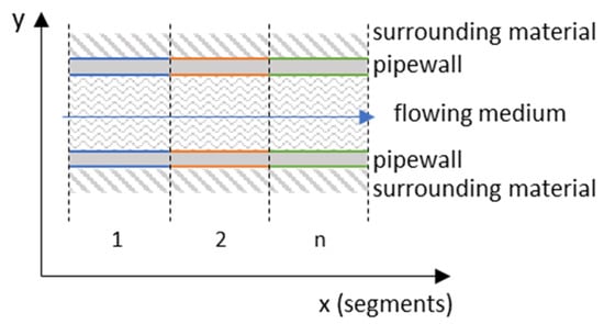 Equation (1) was used to calculate the heat flows per segments from the flowing medium to the pipe and further to the material, but also the heat flows along the length of the pipe for the material, pipe, and flowing medium itself. The in the equation is the heat flow in [W]. Furthermore, is the thermal transmittance in [W/(m2K)], is the heat exchanging area in [m2], and is the temperature difference [K] between two segments (x direction), or between the material, pipe, and medium (y direction).