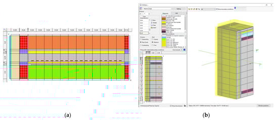 If heat flow in a building element cannot be regarded as being one-dimensional, a three-dimensional component model, the 3D object, can be used. Using the WUFI® Plus software, transient three-dimensional heat flow was solved using the finite volume method [34]. The heat-conducting component was first divided into x, y, and z directions, and material data were assigned to the different compounds. The boundary conditions were either defined by local space conditions or as being adiabatic, which allowed us to use the symmetry and reduce the number of numerical grid elements. The software generated variable discretization with denser subdivision at the edge and at the junction of areas with different materials. Instead of one solid material, there were air cavities inside some building components. The elements defined as air-type materials were grouped into one space and balanced like a heat zone. Implicit or explicit solving methods were applied to obtain the transient temperature distributions. The implemented 3D objects were validated according to DIN EN ISO 10211 [35].