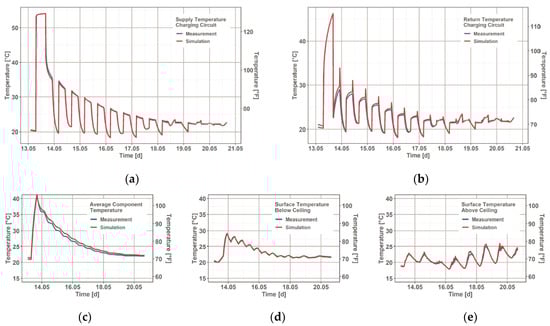 Comparison between measurement and simulation of supply (a) and return (b) temperatures in the TABS in the concrete core of the ceiling. Comparison of component average temperature (c), surface temperature below (d) and above (e) the ceiling, and the 3D object coupled with the TABS model inside.