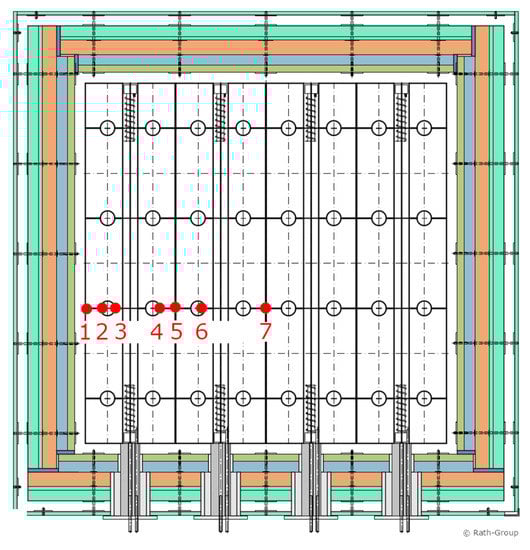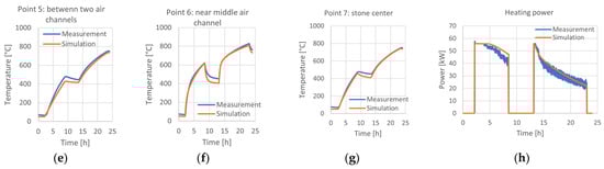 The model representing the HTSS system in the simulation framework was compared with data obtained by the field tests. This paper compares the temperatures at approximately the center of the HTSS, as marked in Figure 10. Graphically, the measured data are compared to the simulation data in Figure 11. The NMBEs for the individual measurement points from number 1 to 7 are as follows: −8.7%; −5.9%; −1.2%; −3.3%; −6.2%; −3.3%; and −3.65%, and for the electrical power it is 5.84%. All of these NMBEs are within the defined tolerance range of +/−10%. In the measurement, the temperature was mostly slightly higher than in the simulation, with slightly lower power introduced. This indicates a higher storage capacity of the simulation model. The ventilation ducts and electric heating elements are correctly considered in the system engineering with the corresponding cross-sectional area and their volume, respectively, but this volume is not deducted in the thermal three-dimensional model in favor of the simplified modeling and considerable reduction in the calculation time.