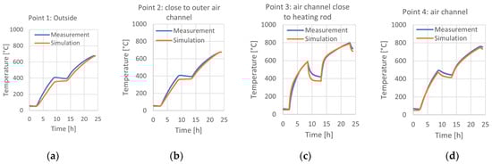 Since the pretest of the high temperature stone storage (HTSS) was conducted on a single heating rod mockup, this setup is not suitable to generate validation data. Therefore, a data period from the final, full-size, HTSS prototype shown in Figure 5a is presented here. The prototype was equipped with about 500 thermocouples to record the heat distribution over the charging periods when the 18 heating coils (1000 °C) heated the stone core up to 800 °C. For the validation, a long heat up period was chosen, and the measured temperature profiles are logged in Figure 5b.
