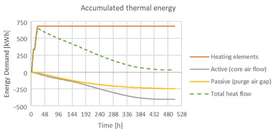 In addition to comparing the measured data, the model of the HTSS system was tested for plausibility and energy conservation. Basically, the storage can only release as much energy as it has previously absorbed. Figure 12 shows the simulated heat flows of the HTSS. The amount of heat initially introduced during charging is released over the course via the core air (active), purge air, and the outer surface (passive) heat release, so the conservation of energy is respected.