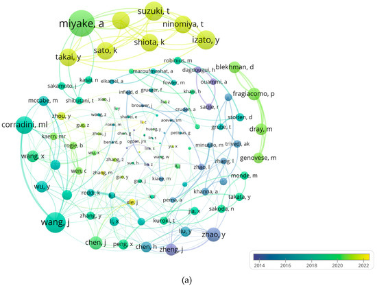In light of current research on relevant keywords, the most active research institutions in the HRS area as well as international collaborations were examined. The primary collaborations were recognized by the use of VOSviewer [32,33], as shown in Figure 2a,b, respectively, by cooperation intensity and most recent activities, by processing the Scopus dataset.