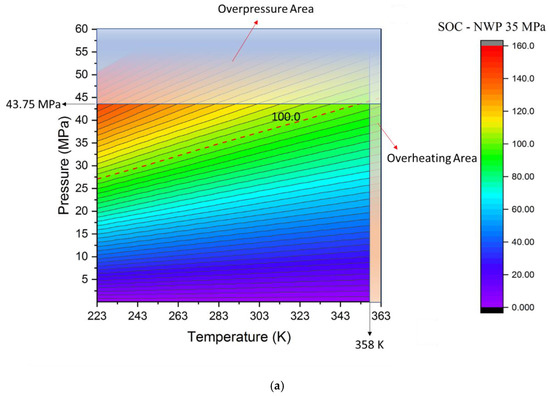 For this reason, an ideal fueling strategy strives to swiftly fill all hydrogen storage systems to a high state of charge (SOC), never exceeding the storage system operational limitations of 85 °C for the internal tank, without overheating and without overfilling (SOC more than 100%) [26]. Moreover, such a procedure must direct hydrogen refueling within an acceptable duration without exceeding the temperature and pressure restrictions, as well as maximum pressure levels, to obtain a suitable SOC, between 90% and 100%, under varying ambient temperatures [27,28].