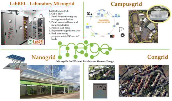 Within the scope of the MERGE (Microgrids for Efficient, Reliable and Greener Energy) project, in addition to the development of test laboratory infrastructure (at LabREI—Interdisciplinary Research in Smart Grid Laboratory), three microgrids are in development: nanogrid (a small microgrid limited to a single Consumption Unity—CU), congrid (a condominium microgrid), and Campusgrid (a microgrid with a medium voltage connection and larger load feeding at a university campus), as illustrated in Figure 2.