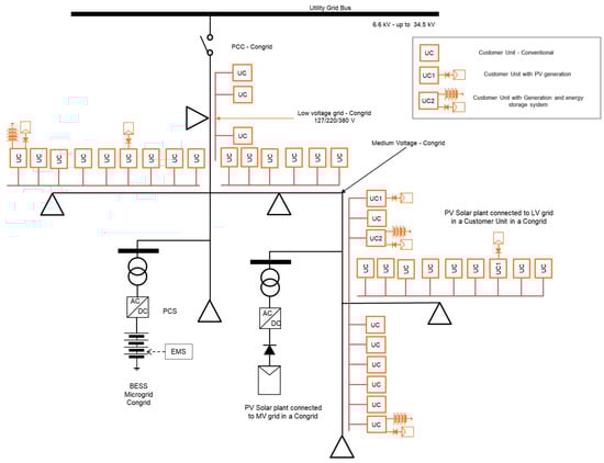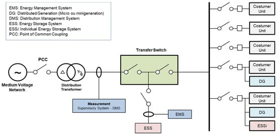 Figure 4 presents an illustrative diagram of a congrid-type microgrid topology with residential/commercial customer units connected to the secondary distribution network (LV). Each customer unit has measurements for individual billing, and may have their own generation and energy storage system.