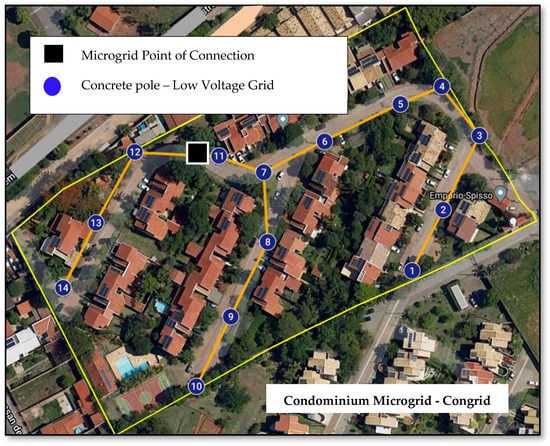 The MERGE congrid microgrid aims to implement a pilot for a set of residential loads, taking the concept to the local utility consumers. In principle, the objective is to design and implement the microgrid in a place characterized as a residential condominium, which would integrate the generation, storage, and management technologies, being able to operate in a connected mode with the distribution network or islanding (forced or intentional). The congrid concept is similar to a community microgrid [45]. However, the main microgrid’s equipment (such as the energy storage system) are owned and operated by the energy distribution company/utility.