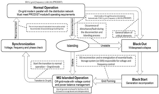 The operation of a microgrid can then be divided into three modes: grid connected, islanded (or autonomous operation), and synchronization/reconnection (transient modes). The main operating modes for microgrids, according to ref. [42], are illustrated in Figure 7.