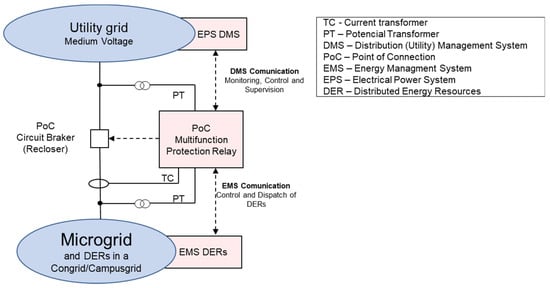 - Protection—which includes concerns about the protections and operation of the microgrid interconnected and on island mode. MG plants operate with internal generation sources able to synchronize in parallel with the distribution grid; therefore, they are required to install a set of protection systems for interconnection with the local grid to ensure that the switch at the PoC (point of connection) will be disconnected from the network once a fault is detected in the grid. One serious challenge facing a microgrid network is designing a proper protection scheme [24].