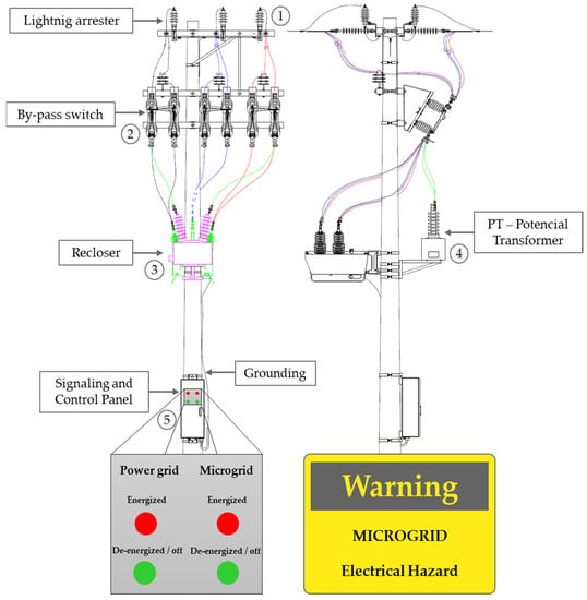 The proposed model also requires an informative plate, indicating the existence of a microgrid type customer unit through a warning message: ‘microgrid—electrical hazard’, as illustrated in Figure 9. The warning signs, made of stainless steel or anodized aluminum, must be permanently affixed to the lid of the measurement box of the input standard or primary cabin of the consumer unit and at the delivery point of the installation (therefore, there are at least two plates, one at the delivery point and the other internally to the microgrid). One of the objectives of this signaling is to warn the maintenance team of the possibility of voltage in the microgrid, even in a situation of interruption in the supply of the utility distribution network.