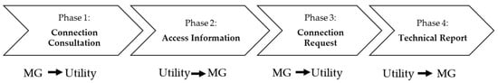 It is recommended that the technical assessment for the connection of new microgrids follow the procedures established for generation enterprises, with a four-step process: Phase 1—Connection Consultation; Phase 2—Access Information; Phase 3—Connection Request; and Phase 4—Technical Feasibility Analysis Report, as illustrated in Figure 10.