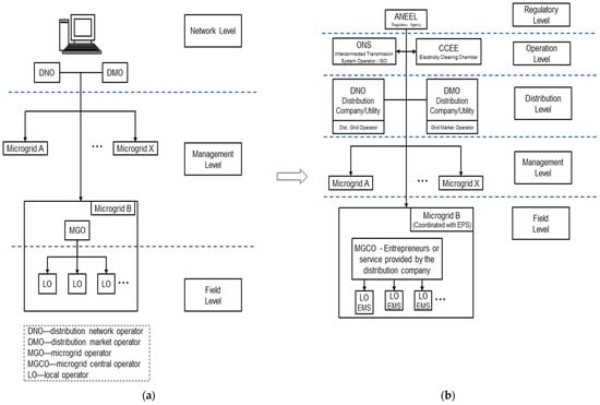 (a) Hierarchical levels in a microgrid. (b) Actors model proposal for microgrids in Brazil.