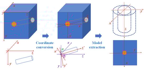 As shown in Figure 1, a Cartesian system is established to analyze the stress field of the coal around the borehole: a linear pore elastic model and the coordinate transformation equation are used to convert the stress state distribution of the borehole in the natural spatial coordinate system to a stress model in x, y, and z directions centered on borehole to solve for the stress distribution around the borehole. The model was constructed using PFC software to build a 700 mm × 700 mm 2D model with a 30 mm diameter borehole at the center of the model, and the 4 boundaries of the model were fixed, i.e., the particles at the boundaries of the model were fixed.