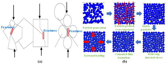 The particle flow model is completed by several computational cycles, i.e., updating the contact force of the particle contact part by the force-displacement law, updating the particle and wall position by Newton’s second law, and readjusting the contact relationship between the particles, both of which act alternately to traverse the entire model ensemble until equilibrium is reached or damage occurs that cannot be kept stable.