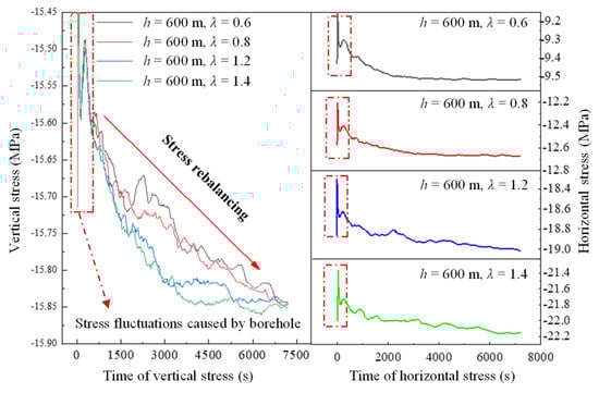 As shown in Figure 4, after the formation of the borehole, the coal around the borehole will go through the force fluctuation stage and force re-equilibration process under different side pressure coefficients. When the borehole was first formed, the stress level decreased rapidly due to the unloading effect. Then, the stress gradually increased, and a new stress balance was reached. With the increase in the side pressure coefficient, the stress level in the vertical direction increased. The time required to re-equilibrate the stress in the coal around the borehole was basically the same under different side pressure coefficients. The change of stress in the horizontal direction was basically the same as that in the vertical direction. Firstly, the stress changed abruptly to unload the pressure, then the stress fluctuated and finally reached equilibrium again. The stress after equilibrium was increased compared with that before equilibrium, and the presence of a borehole will make the stress distribution of coal rock change, and the stress concentration occurred in the coal around the borehole.