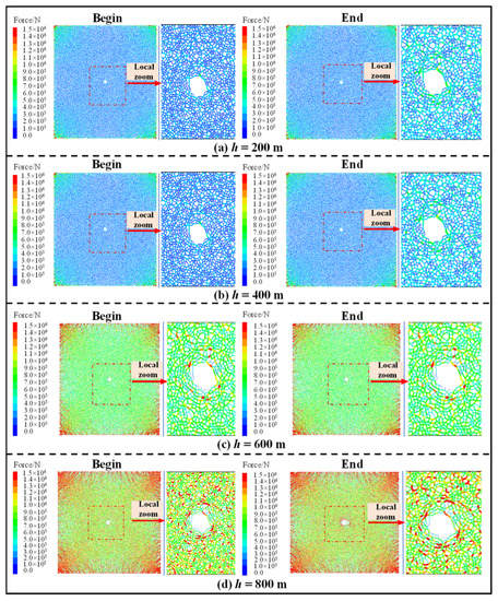Distribution of force chain around borehole at the beginning and end of simulation with different burial depths of (a) 200 m, (b) 400 m, (c) 600 m, and (d) 800 m.