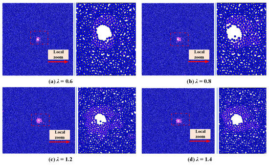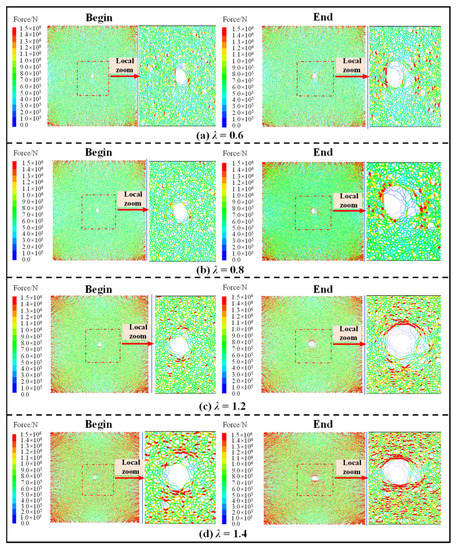As shown in Figure 6, with the increase in the side pressure coefficient, the location of stress concentration gradually changed from a horizontal direction to a vertical direction. When λ was less than 1.0, the stress concentration was mainly concentrated in the vertical direction, and the direction of the force chain was up and down. When λ was greater than 1.0, the stress concentration was mainly concentrated in the horizontal direction, and the stress on the left and right sides was concentrated in the horizontal direction of the force chain. As λ increased, the top vertical stress and horizontal stress on both sides will increase, but the growth rate of top vertical stress was faster than the growth rate of horizontal stress on both sides. Compared with the time when λ was less than 1.0, the stress concentration area was more obvious when λ was greater than 1.0, and the coal around the borehole was more deformed and more prone to instability at this time.