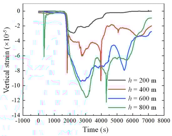 The vertical deformation of coal around the borehole under different burial depths is shown in Figure 7. When the burial depth is 200 m, the strain level of coal around the borehole was the lowest, and the spatial range exceeding the critical value of plastic deformation was relatively small. Comparing the experimental results of different burial depths, it can be seen that with the increase in burial depth, the deformation of coal around the borehole increased, and the deformation rate increased. Until the burial depth was the largest, the vertical displacement of coal around the borehole changed the most.