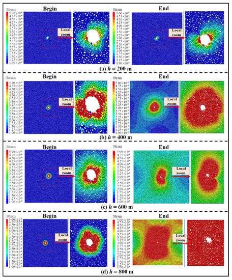 Figure 8 shows the strain changes around the borehole at the initial stage of the borehole and after stabilization of the borehole under the conditions of burial depths of 200 m, 400 m, 600 m, and 800 m. Under h = 200 m (Figure 8a), the strain mainly occurred in the process of borehole formation. At the end of the subsequent borehole, the strain range around the borehole was further expanded. Through simulation, it was found that there was a certain direction in the deformation process. The coal underwent a large deformation along the straight line, and the vertical direction with this straight line would appear small deformation. This was caused by the difference between the distribution of the maximum deformation direction and the minimum deformation direction at 200 m burial depth. At the same time, it could be seen that there was a π/2 deflection angle in the large and small deformation zone. Under h = 400 m (Figure 8b), the strain distribution was not uniform at the initial stage of borehole formation, and the deformation of coal around the borehole was small. After the coal deformation was stable, the deformation was large, which was different from the deformation under h = 200 m. Under high-stress action, the borehole’s deformation was more rapid and more severe after the borehole process, and the displacement field gradually changed from the initial uneven distribution to a uniform trend. The strain of coal showed random directionality at the beginning, and then with the stable deformation of coal, the deformation tended to be uniform, indicating that with the increase in in situ stress levels, the in situ stress levels became the dominant borehole deformation factor, which determined the stress distribution of coal after borehole stability.