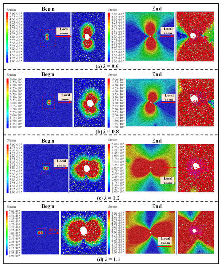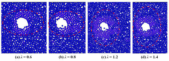 Figure 11 shows the distribution of fractures around the borehole with different side pressure coefficients. As shown in Figure 11, areas of stress concentration induced the production of large deformations, which led to the development of fractures. However, a special phenomenon existed: many fractures were still produced in the low-stress and small deformation areas perpendicular to the main deformation direction. This was due to the large deformation generated around the borehole in the high-stress direction, which drove many pores in the low-stress direction, causing the coal around the borehole to crack and form many fractures under low-stress conditions. Under the condition of λ ≠ 1, there was inhomogeneity in the development of fractures, with more fractures being produced on one side and fewer on the other side. The deformation in the high-stress direction was not completely uniform, and the corresponding inhomogeneity would also occur on the low-stress side.