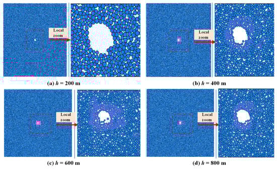 According to Equation (9), the damaged area around the borehole with increasing burial depths can be obtained with the side pressure coefficient λ = 1.0, and its schematic diagram is shown in Figure 14b. According to the results of theoretical analysis, it can be seen that under λ = 1.0, the fracture mainly shows circular distribution under different burial depths, and the fracture circle keeps increasing with the increase in burial depth (Figure 15).