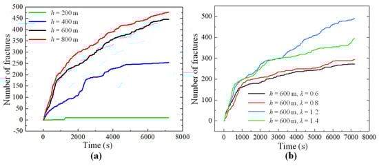 Number of fractures evolution. (a) Different burial depths; (b) different side pressure coefficients.