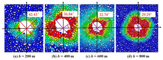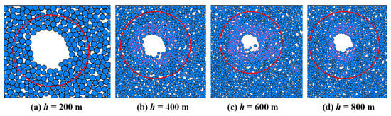 Under h = 600 m (Figure 5c), the overall stress level was further increased, and at the early stage of borehole formation, long and thin blue force chains appeared around the borehole, which was prolonged by the movement of model particles toward the center of the borehole after borehole formation. Due to the movement deformation unloading pressure, the coal stress level decreased and became thin to show a blue color. It indicated that under the burial depth of 600 m, the phenomenon of borehole wall shedding may occur, the stress connection between the borehole wall particles and the borehole wall is weak, and the borehole closure may also occur under the condition of weak disturbance. The stress concentration around the borehole appeared in a ring shape, and under h = 600m, the stress concentration was distributed in a larger radius compared with that in 200 m and 400 m. Under h = 800m (Figure 5d), the overall stress level increased again, and the stress distribution resembled a patchy shape, which was scattered and widespread. This indicated that, under the high-stress effect, a large amount of energy was accumulated inside the coal, and a small unconnected stress concentration chain existed. Under the action of external disturbance, the distributed stress concentration was connected and will cause failure in the coal and borehole. From Figure 5d, we could see that under h = 800m, the failure form of the borehole was basically the same as under h = 600m, both were affected by the high ground stress, but after the stress stabilization of the coal, the distribution of the stress chain was somewhat different from that under h = 600m, and the stress was uniformly dispersed without collapse of the borehole.