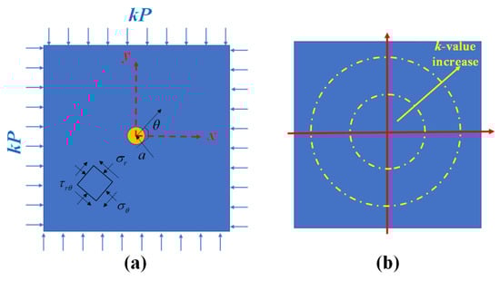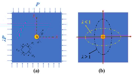 To demonstrate the reasonableness of the numerical results under different side pressure coefficients, the linear elastic infinite plate inner circle model (Figure 16a) is introduced to obtain the fracture distribution law around the borehole under different side pressure coefficients. The stress distribution around the borehole can be expressed as Equation (10).