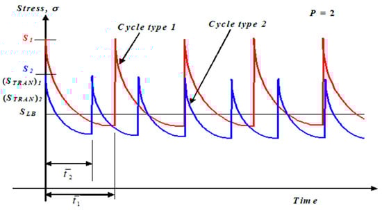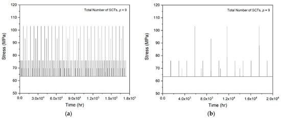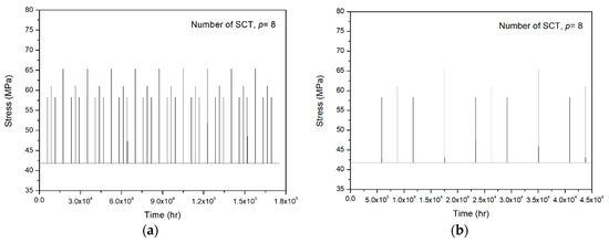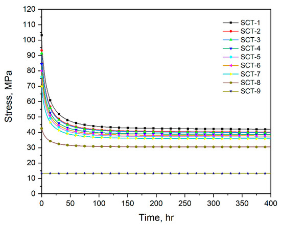 According to Step-5 of the creep evaluation procedure, Figure 16 presents the stress relaxation time histories obtained from the isochronous stress–strain curve corresponding to the hold temperature of 650 °C during the average cycle time of each SCT, which have the initial stress levels of Table 8.