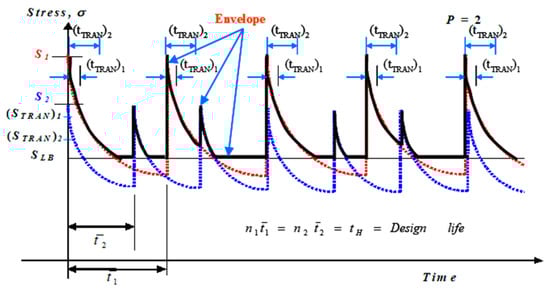 (Step-7): Superpose the modified stress relaxation time histories repeatedly, extending to the entire design lifetime, as shown in Figure 4, and determine the representative enveloped stress relaxation time history as shown in Figure 5.