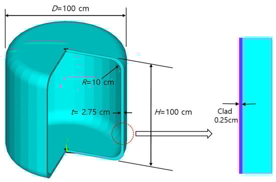 The exampled nuclear component considered in this study is a high-temperature molten salt reactor vessel shaped as a simple cylindrical structure as shown in Figure 6. Both the inner diameter and height of the reactor vessel is 1 m, and the thickness of the base material is 2.5 cm. The inner surface in contact with the corrosive salt coolant is cladded with 0.25 cm thickness, which is 10% of the base material thickness.