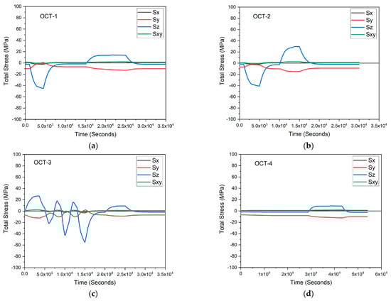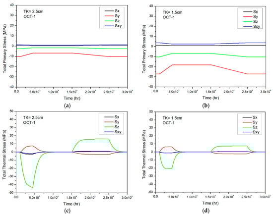 Comparison of total stresses for OST-1: (a) for pressure (TK = 2.5 cm); (b) for pressure (TK = 1.5 cm); (c) for thermal (TK = 2.5 cm); (d) for thermal (TK = 1.5 cm).