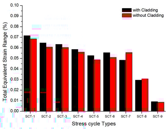 To investigate the effect of the cladding material applied in this study, a fatigue damage evaluation is performed for a case of no-cladded component. Figure 15 shows the comparison results of the total strain ranges with and without cladding material for each SCT. As shown in the figure, we can see that the cladding material affects the total equivalent strain range and slightly increases it. Then, in the case of no-cladded component, the accumulated fatigue damage value decreases to 0.6316 × 10−5.