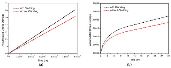 Comparison of accumulated creep damage time histories between cladded and no-cladded component: (a) during entire lifetime; (b) zoomed to 30 h.