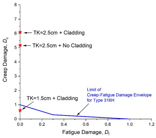 - The corrosion resistance cladding material applying to the nuclear components affects the temperature distribution through the vessel wall thickness and can increase creep-fatigue damage value by thermal stress increment. Therefore, the cladding material in the nuclear cladded components needs to be carefully considered for creep-fatigue evaluation.