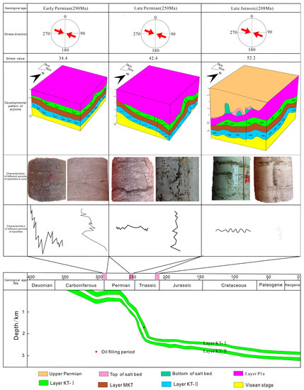 Li, C.; Zhao, L.; Li, W.; Zhao, W.; Sun, M.; Zhang, Y.; Zheng, T. Formation Timing and Features of Stylolites and Controlling Factors for the Second-Period Stylolites in the Carboniferous KT-I Formation of NT Oilfield. Energies 2023, 16, 2909. https://doi.org/10.3390/en16062909