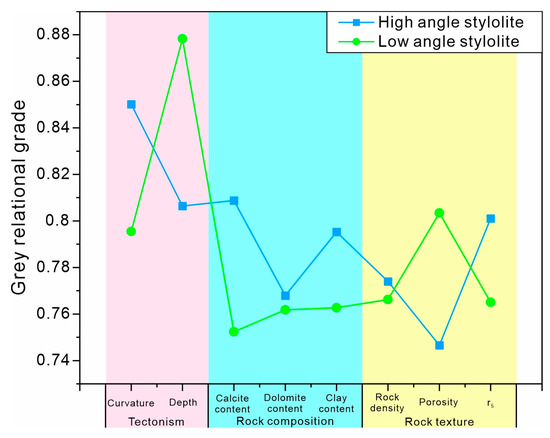 | Controlling Factors | Grey Relational Coefficient for High-Angle Stylolite | Ranking | Grey Relational Coefficient for Low-Angle Stylolite | Ranking |