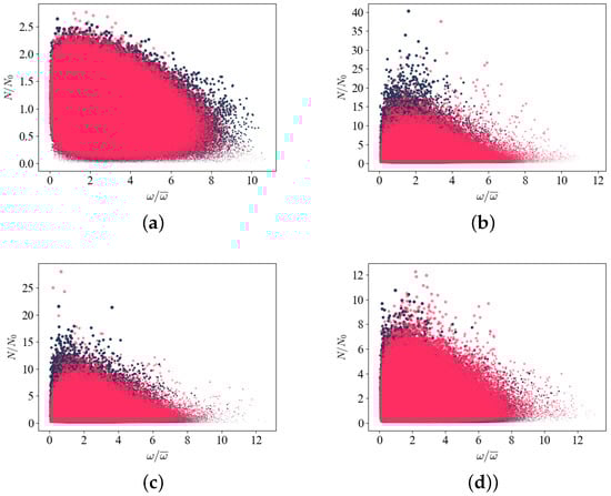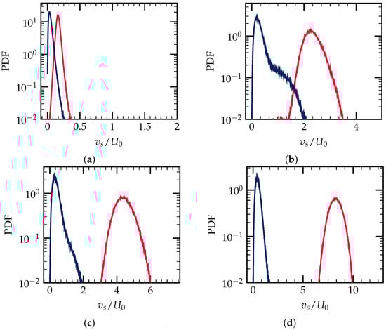 ); the normalized particle slip velocity. (a) ; (b) ; (c) ; (d) .