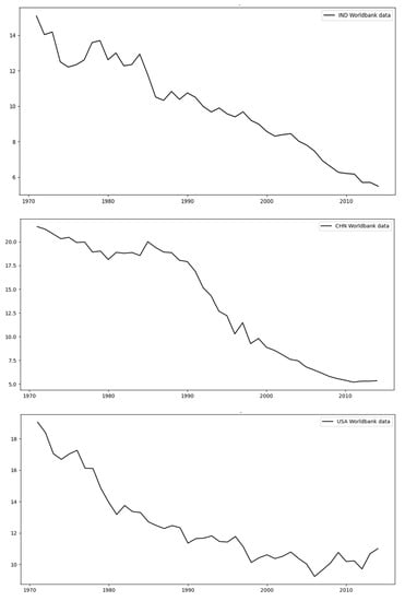 Figure 3 and Figure 4 below show the original data for each of the different regions considered in this study. By observing these data, we can determine that there are two main types of regions: those with a relatively small variability (Figure 3) and those with high variability (Figure 4). The first set includes the regions India (IND), China (CHN), the USA, the World (WLD), and the European Union (EUU), as can be seen in Figure 3 below; these datasets follow straight trends with some fluctuations, with WLD exhibiting the smallest amount of fluctuation as opposed to that for EUU.