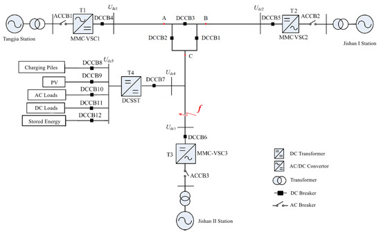 In this paper, the MTDC distribution system was used, which is shown in Figure 1. T1–T3 are AC/DC converters based on MMC; T4 is the DC transformer; DCCBn (n = 1, 2, …, 7) represents the DC circuit breaker; ACCBn (n = 1, 2, 3) represents the AC circuit breaker; and is the fault point. The system adopted the master–slave control mode, which has high control convenience [8], and T1 adopted the fixed DC voltage and reactive power control mode (VdcQ); T2–T3 adopted the constant power control mode (PQ). The system had a communication system to change control mode according to the situation.
