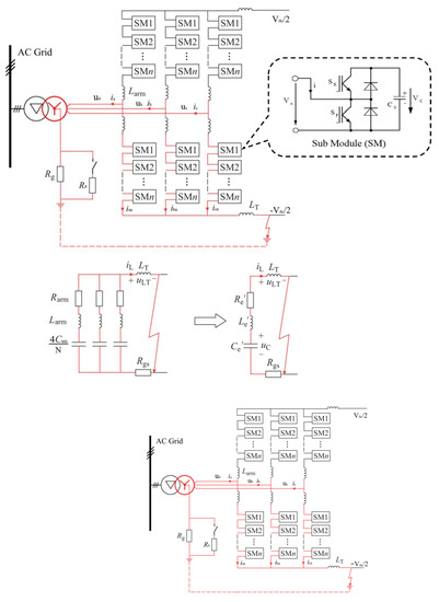 Taking T3 as an example, the SPG fault model of MMC was established, as shown in Figure 1. After a single-pole ground fault occurs, due to the grounding of the AC side of the system, the capacitors of each faulty pole bridge arm will form a capacitive discharge path through the fault ground point and the AC side ground point. Taking the ground fault of the negative busbar as an example, the discharge path is indicated by red lines, which is shown in the Figure 2.