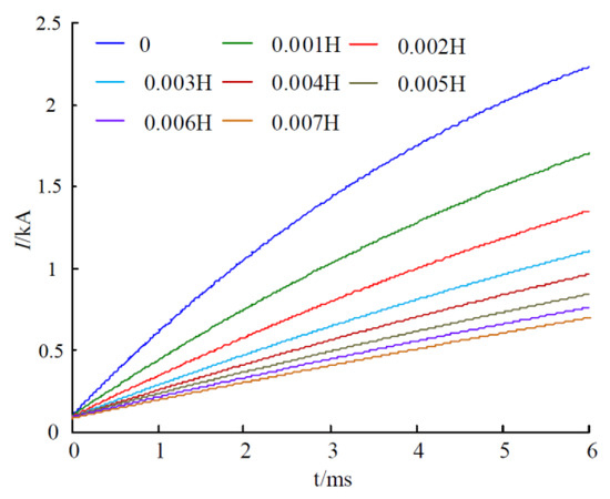 When , and is cut off, the fault current is only suppressed by the DC reactor. According to the parameters of the converter station, the changing trend of the fault current with is shown in Figure 3. When = 0, , the maximum fault current reaches 2.3 kA at 6 ms, which will reduce the reliability of the DCCB. The DC reactor can reduce the peak value and slope of the fault current. When , the fault current is reduced to approximately 1 kA at 6 ms. In order to protect the safety of personnel and equipment, a large grounding resistance is usually set, and can be set here.