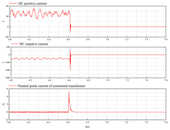 Before the fault occurred, , , . When t = 6.61 s, a ground fault occurred at the DC negative pole of T3. The system detected an imbalance between positive voltage and negative voltage. At this time, the minimum value of reached −30 A, the minimum value of reached −200 A, and the peak value of the neutral point current was 5.2 A, which was far less than the short-circuit current of 1.5 kA in the related research [10]. It can be considered that the negative ground fault had a greater impact on the negative current than on the positive current. After 3 ms, the system turned on the small resistance = 650 Ω, and confirmed that it was a SPG fault. When t = 6.613 s, the DC positive and negative poles tripped the DC circuit breaker, , . The three-port DC circuit breakers DCCB2 and DCCB3 connected to T3 were tripped at the moment of 6.662 s, and T3 was isolated. Figure 5 shows the DC positive current, DC negative current, and neutral point current of T3.